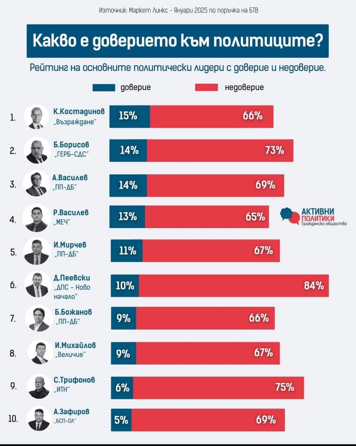 Харесва ли ни или не, единственият политик с позитивен резултат е Румен Радев - 44% одобрение и 36% неодобрение. Останалите са уволнени от обществото.