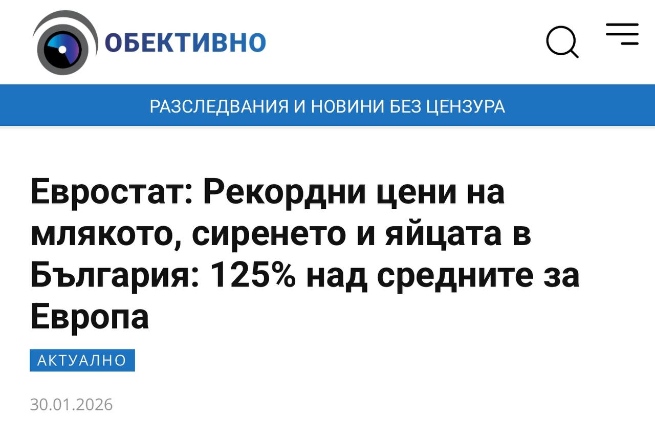 - Според официални данни на Евростат (статистическата служба на ЕС) цената на млякото, сиренето и яйцата у нас е 125% от средноевропейските нива. Хлябът - 73,1%, месото - 74,8%.